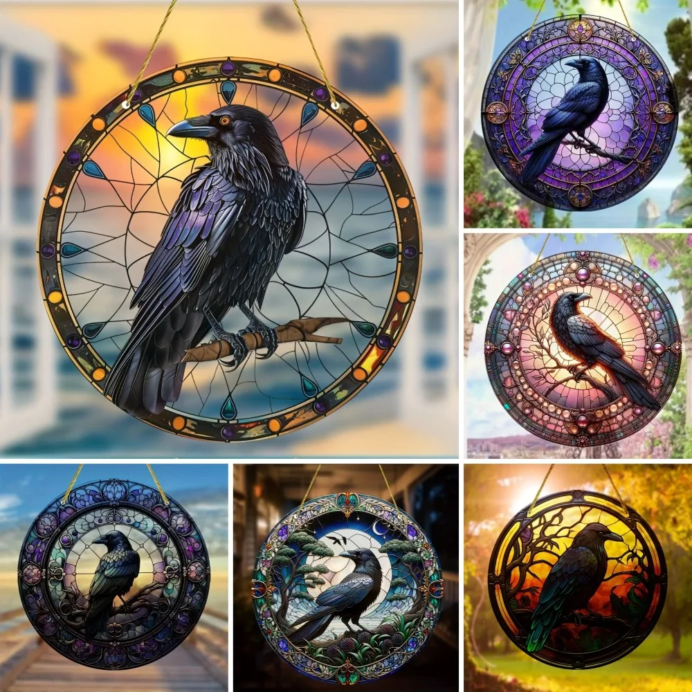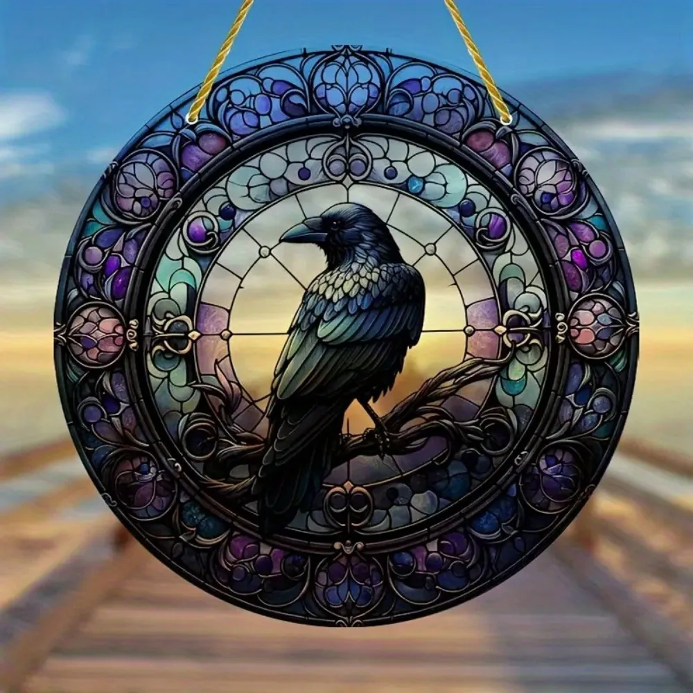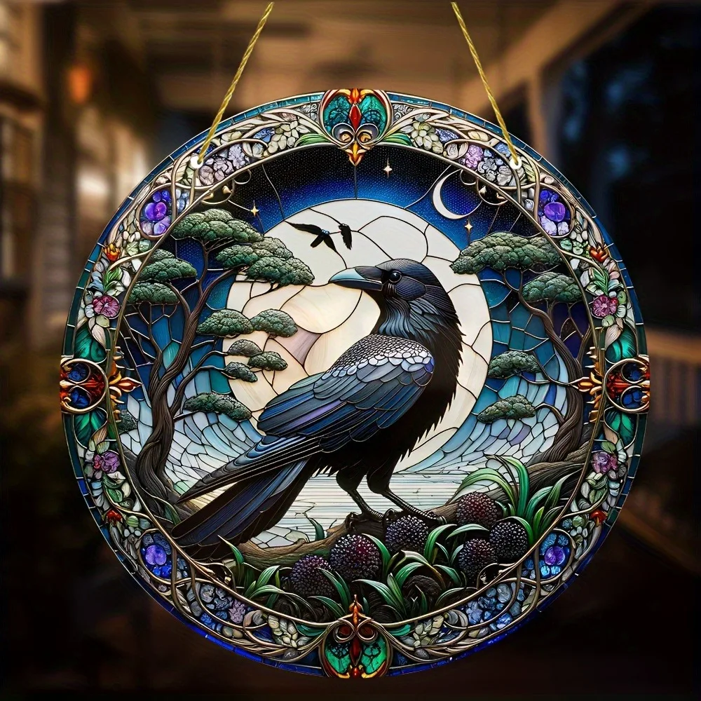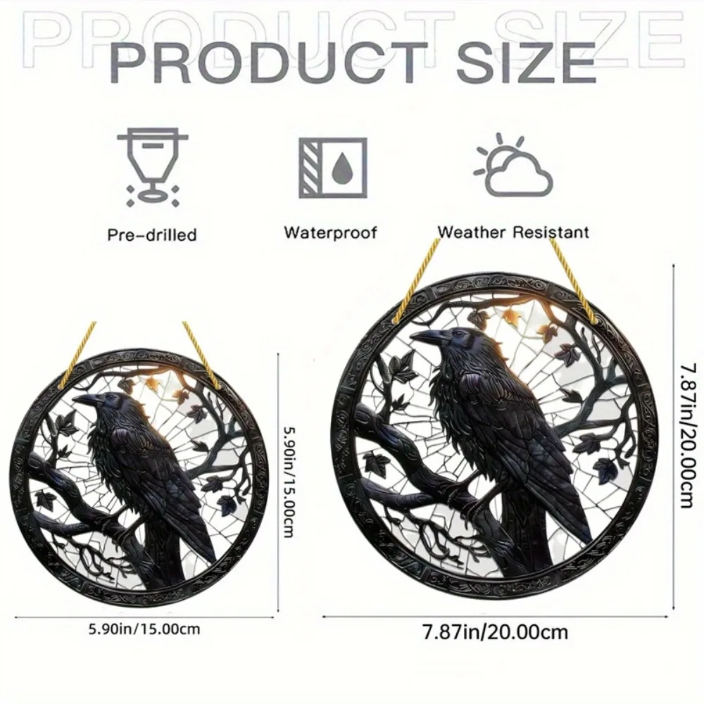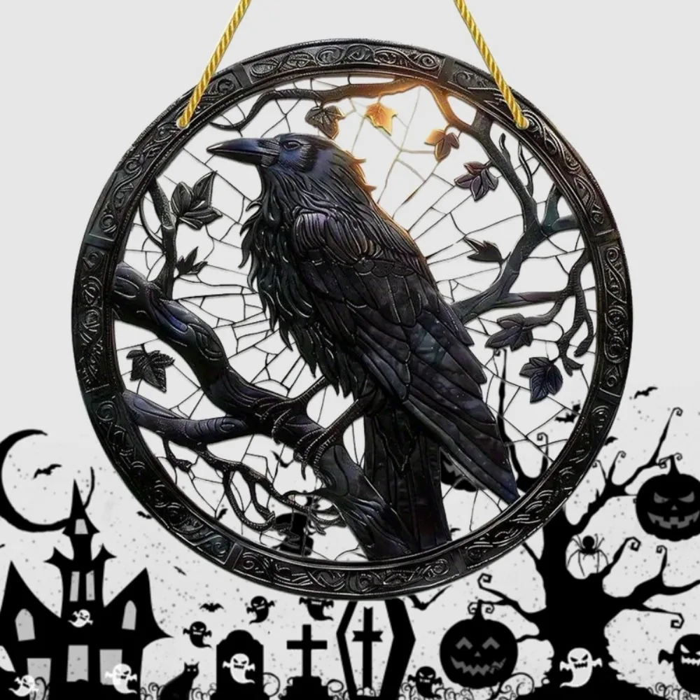 Halloween Black Crow Window Hanging Suncatcher, Round Acrylic Sign, Wreath Center, Porch Garden Home Courtyard Office Decoration