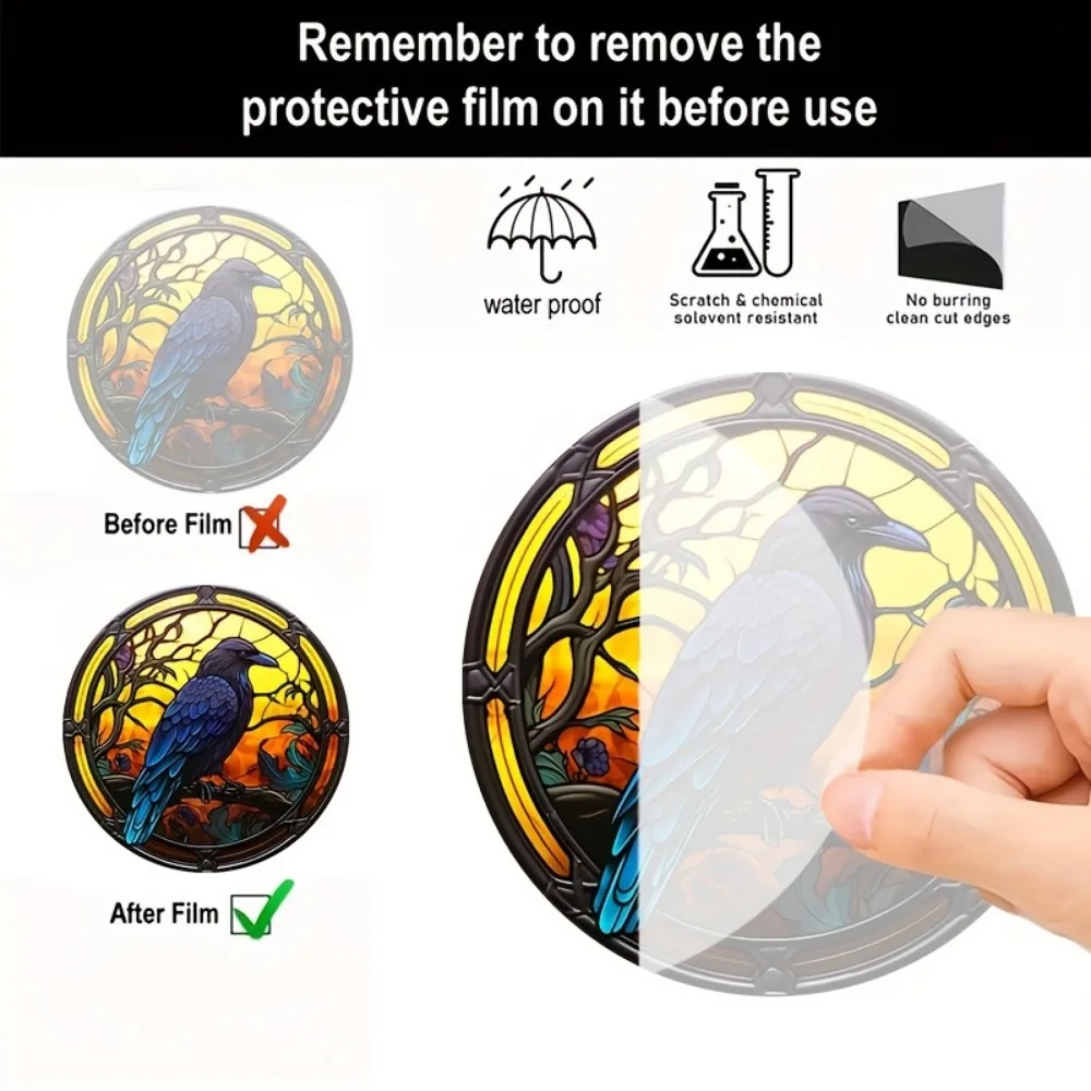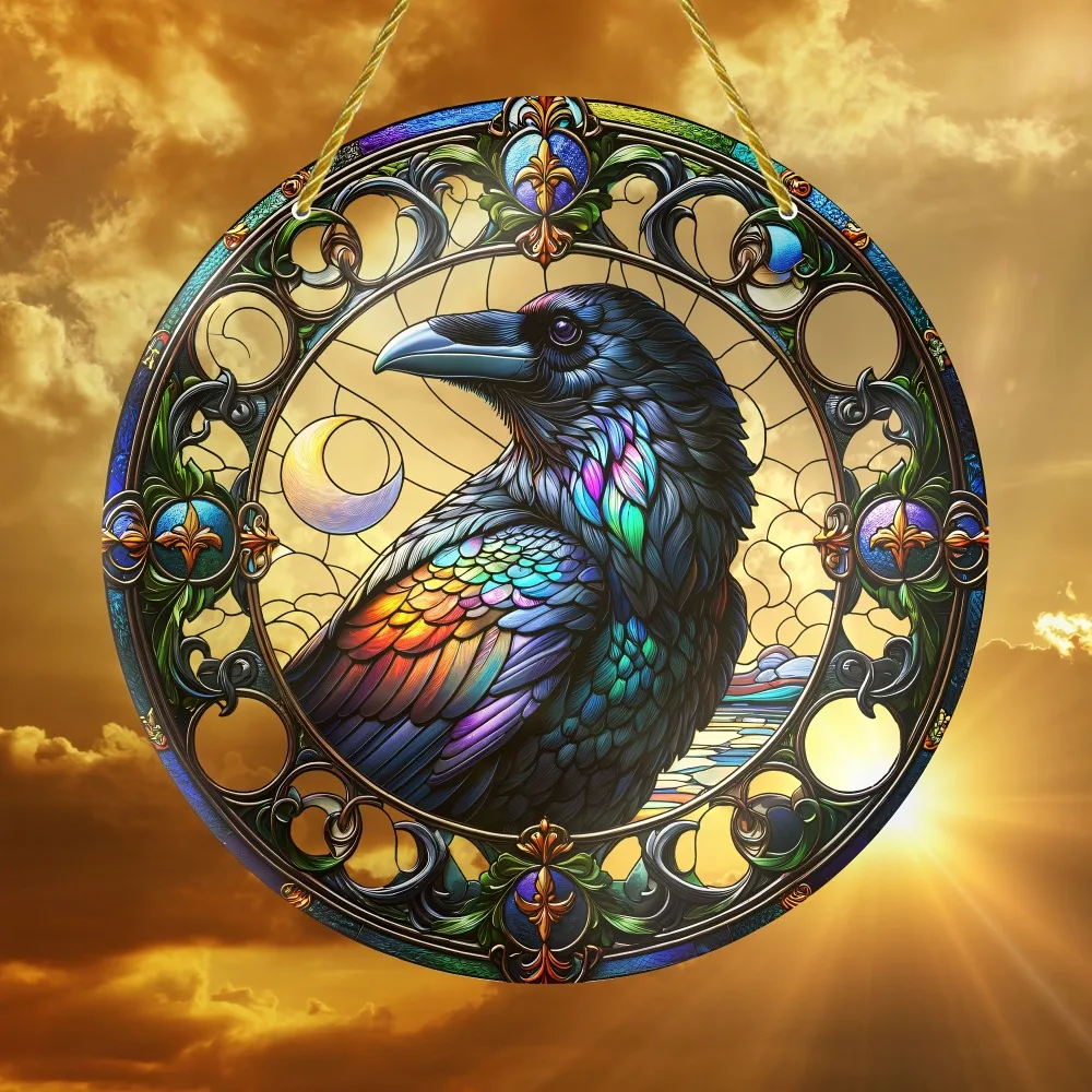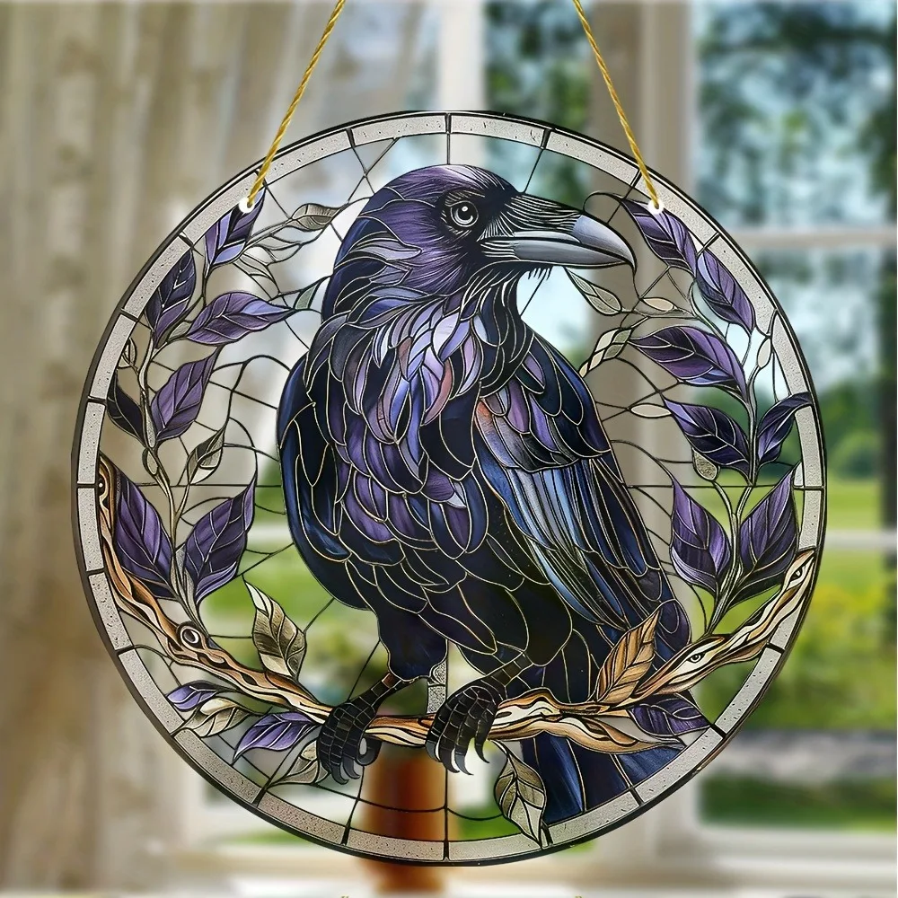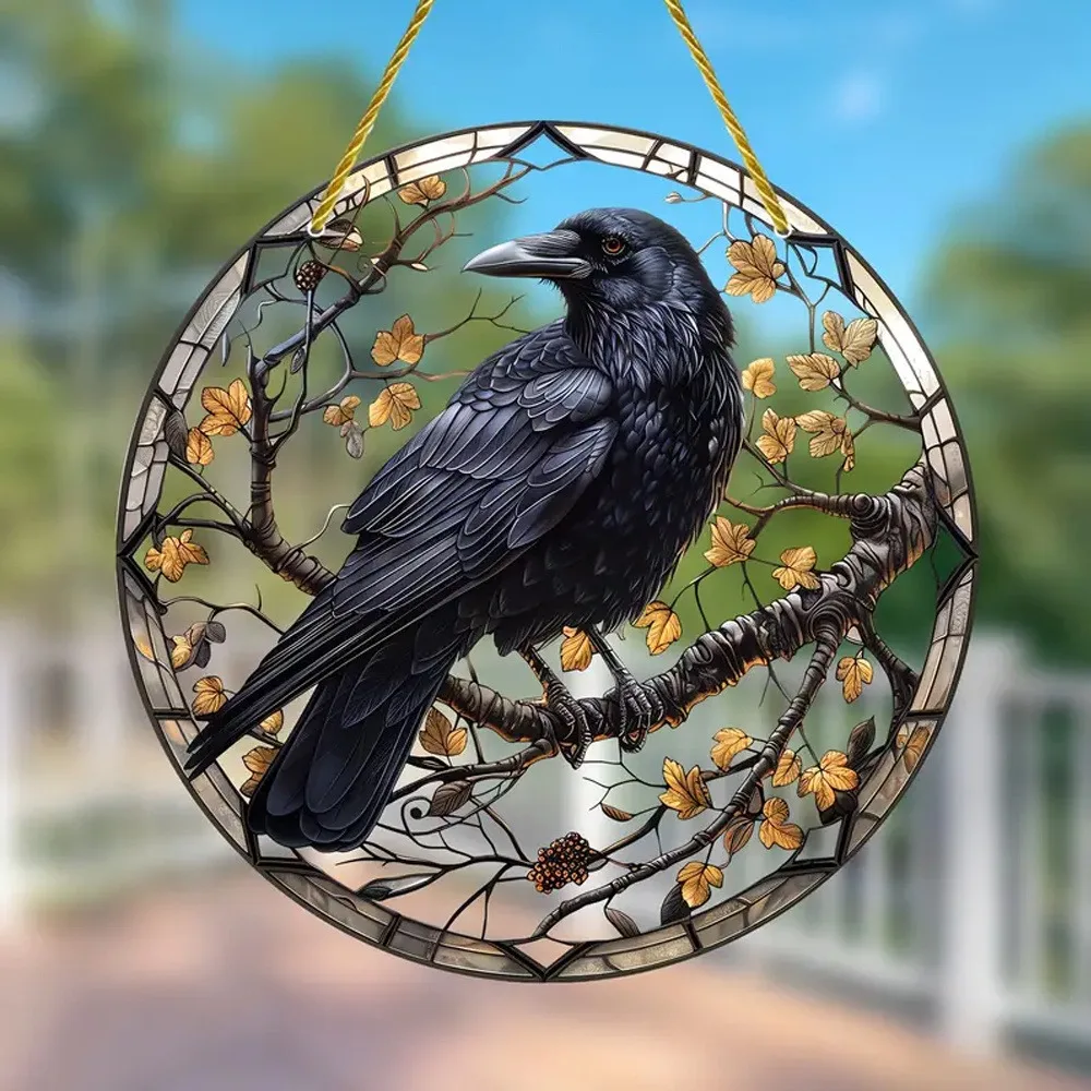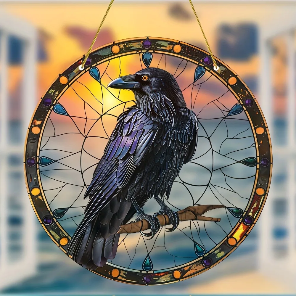 Halloween Black Crow Window Hanging Suncatcher, Round Acrylic Sign, Wreath Center, Porch Garden Home Courtyard Office Decoration