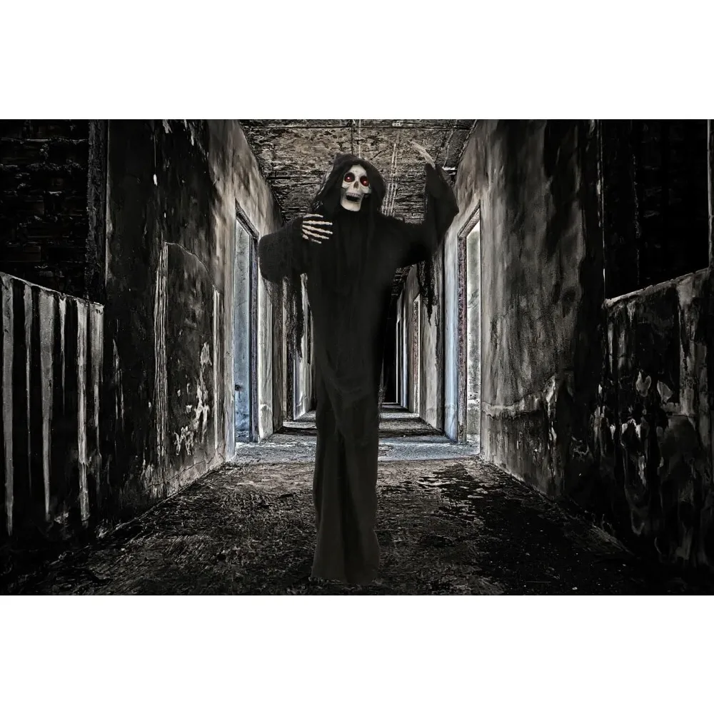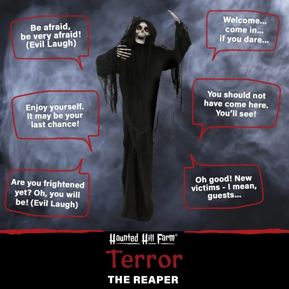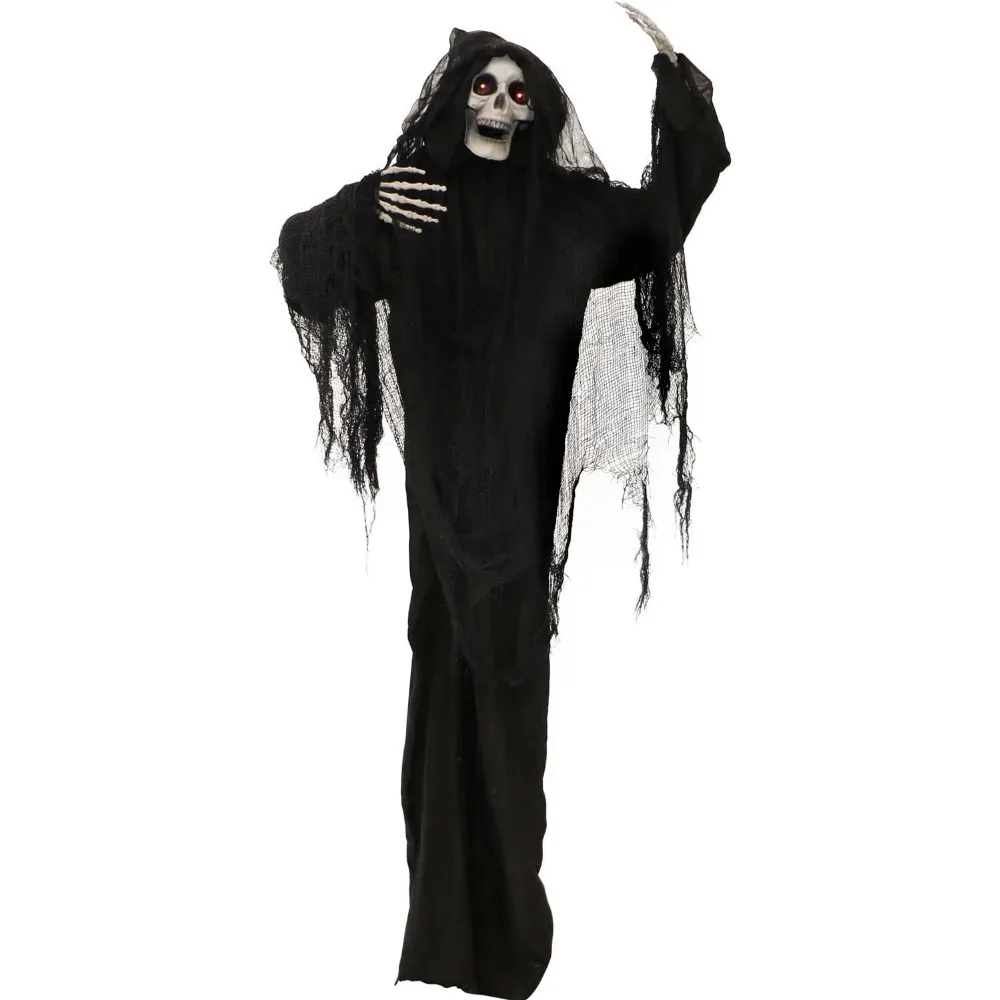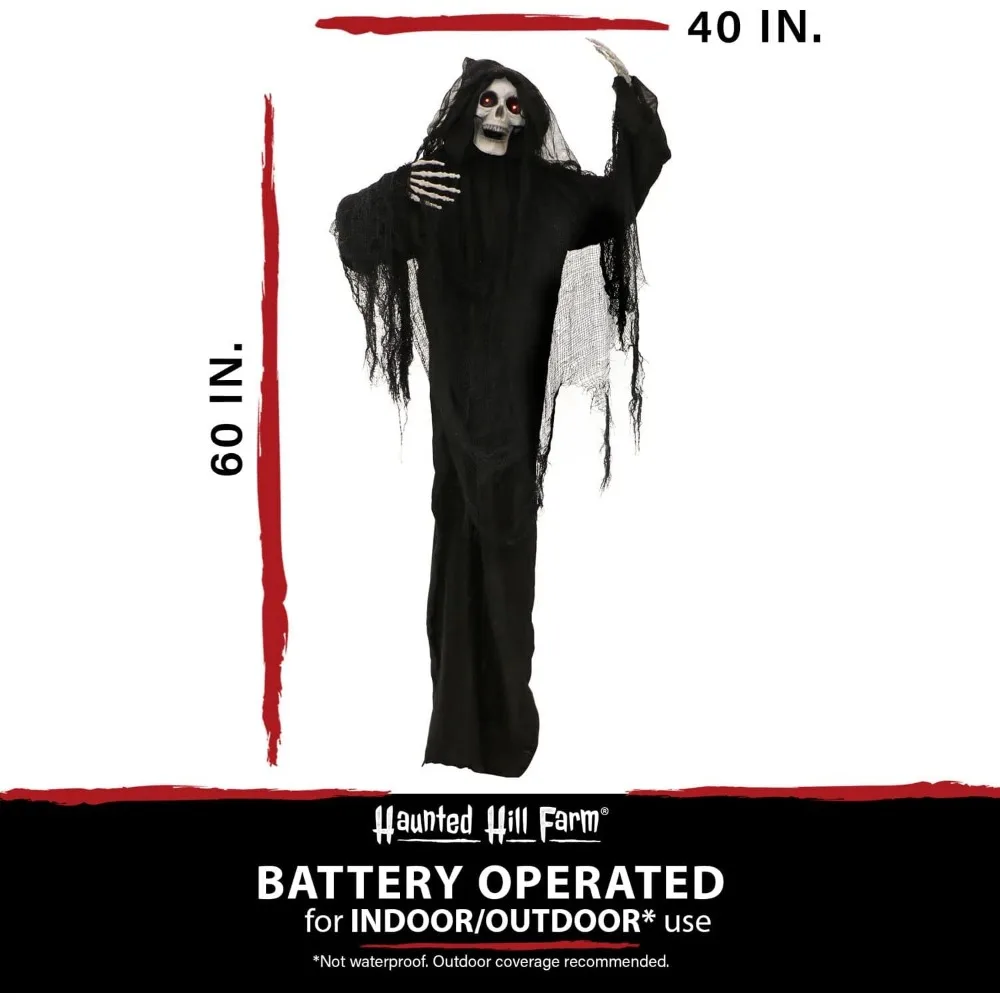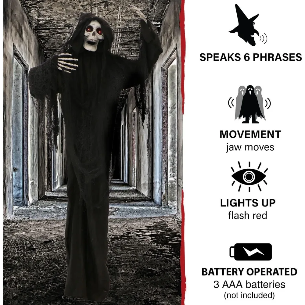 Life-Size Animatronic Scary Talking Grim Reaper with Touch Activated Lights and Sounds, Covered Outdoor Halloween Decorations
